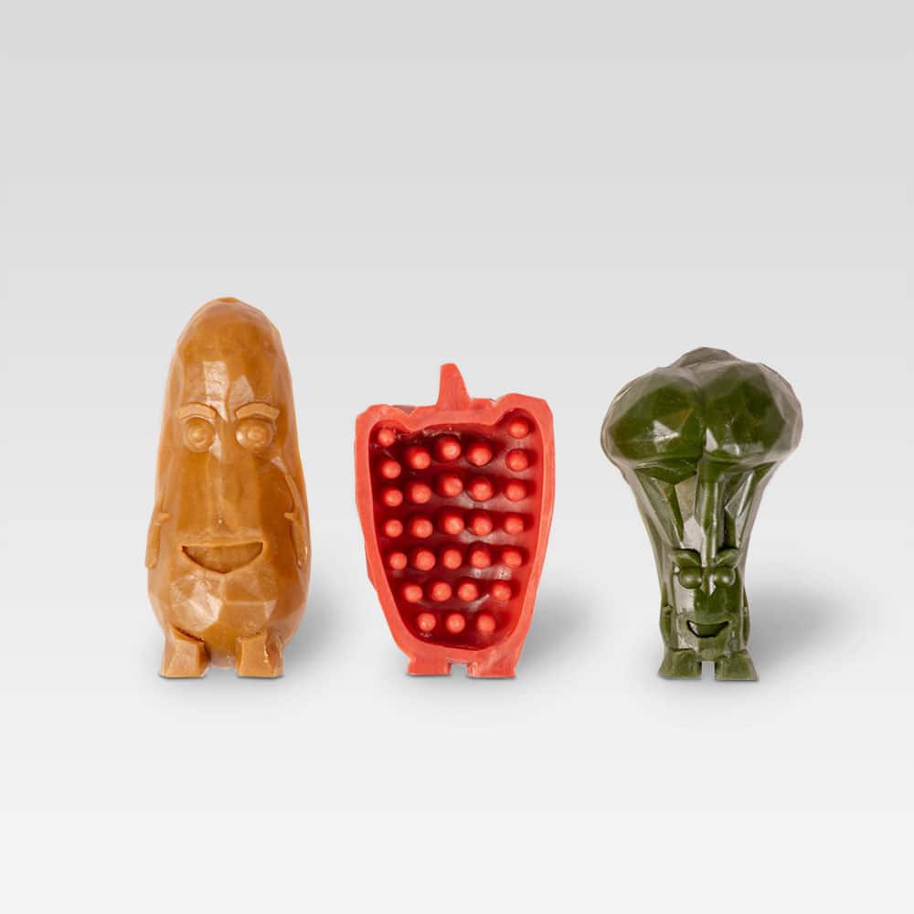 Gemüsegesichter als Kausnack in 2 Grössen und 3 Farben