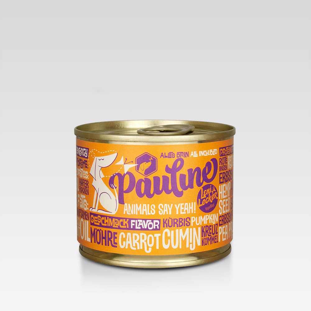 Pauline wurde von Leni Lecker mit Experten aus dem Bereich der Tierernährung entwickelt. Als Alleinfutter stellt es alle nötigen Nährstoffe für ausgewachsene Hunde bedarfsgerecht bereit. Proteine liefert Pauline aus Roten Linsen, Erbsen, Hanfsamen, Haferflocken und Erbsenprotein. Die Hanfsamen bieten neben den Proteinen auch eine gesunde Quelle für Fettsäuren, ergänzt durch Kokosöl. Möhre, Kürbis, Tomatenmark und Kreuzkümmel verfeinern den Geschmack von Pauline. Ein Grossteil der Zutaten von Pauline sind in Bio Qualität. Das Kalzium Phosphor Verhältnis von 1.3:1 liegt im optimalen Bereich.