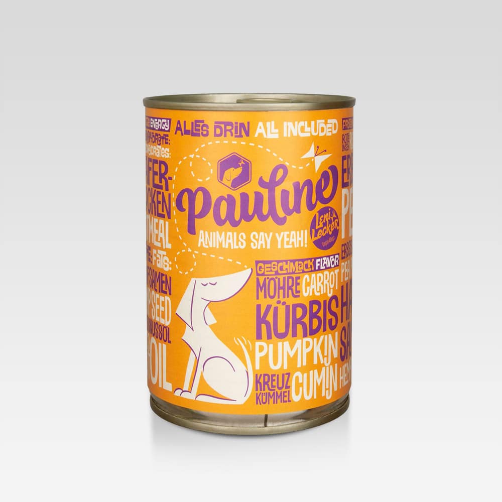 Pauline wurde von Leni Lecker mit Experten aus dem Bereich der Tierernährung entwickelt. Als Alleinfutter stellt es alle nötigen Nährstoffe für ausgewachsene Hunde bedarfsgerecht bereit. Proteine liefert Pauline aus Roten Linsen, Erbsen, Hanfsamen, Haferflocken und Erbsenprotein. Die Hanfsamen bieten neben den Proteinen auch eine gesunde Quelle für Fettsäuren, ergänzt durch Kokosöl. Möhre, Kürbis, Tomatenmark und Kreuzkümmel verfeinern den Geschmack von Pauline. Ein Grossteil der Zutaten von Pauline sind in Bio Qualität. Das Kalzium Phosphor Verhältnis von 1.3:1 liegt im optimalen Bereich.