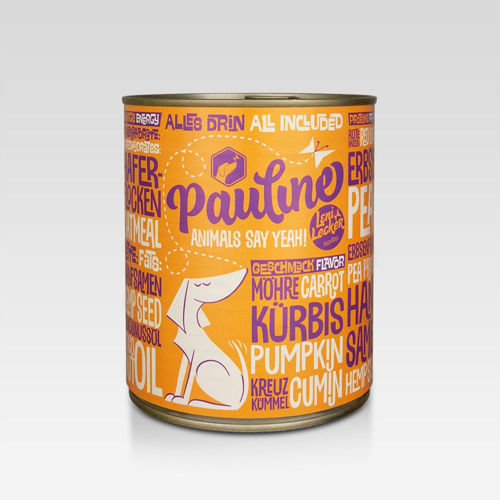 Pauline wurde von Leni Lecker mit Experten aus dem Bereich der Tierernährung entwickelt. Als Alleinfutter stellt es alle nötigen Nährstoffe für ausgewachsene Hunde bedarfsgerecht bereit. Proteine liefert Pauline aus Roten Linsen, Erbsen, Hanfsamen, Haferflocken und Erbsenprotein. Die Hanfsamen bieten neben den Proteinen auch eine gesunde Quelle für Fettsäuren, ergänzt durch Kokosöl. Möhre, Kürbis, Tomatenmark und Kreuzkümmel verfeinern den Geschmack von Pauline. Ein Grossteil der Zutaten von Pauline sind in Bio Qualität. Das Kalzium Phosphor Verhältnis von 1.3:1 liegt im optimalen Bereich.