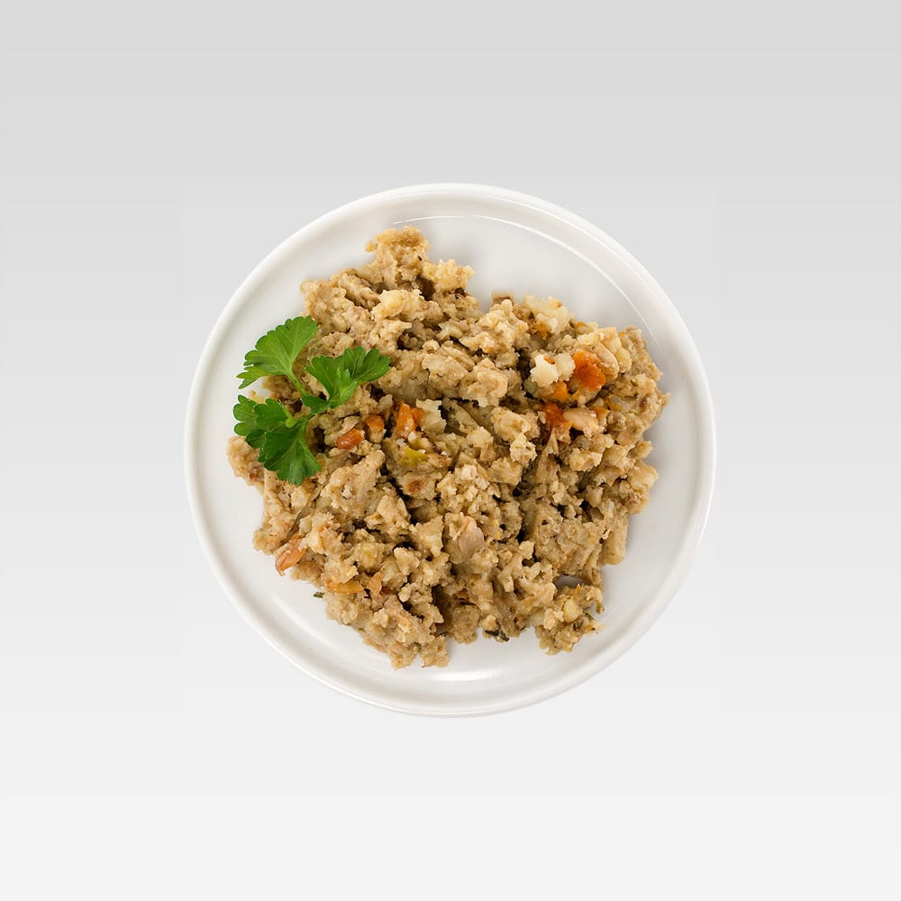 14.5 % Kartoffeln, Hirse, Erbsenprotein, 3 % Zucchini, Karotte, 3 % Erbsen, Linsen, 3 % Lupinenprotein, Sonnenblumenkerne, Mineralstoffe, Sonnenblumenöl, 0.5 % Chiasamen, Hefe, Algen, Gingko, Brennessel, Kamille, Salbei